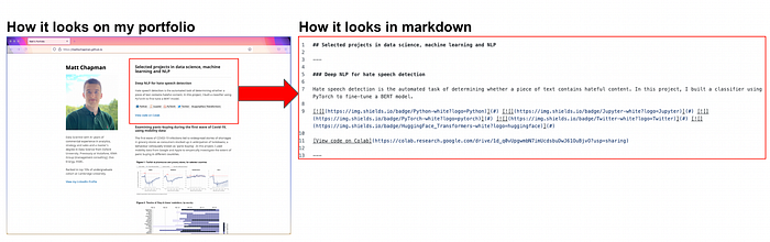 As you can see, I didn't waste time setting the context and explaining the nuances of the results. Sure, that stuff is super important. But if the prospective employer is interested, they'll ask you in the interview. At this stage, you just need a short description which can pique their interest and prompt further discussions later on down the line. If you like, you can even include a link to more description elsewhere; that's kind of what I've done by including a link to the code underneath the project description. But on the main page of your portfolio, you just need the high-level details. Anything else is wasting time.