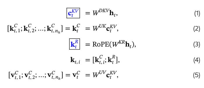 - A down-projection weight matrix W(DKV) is introduced and is multiplied with the input sequence to obtain a compressed latent vector C(KV) for keys and Values. This latent vector is stored in cache, which is significantly smaller in size when compared to the full key and Value vectors